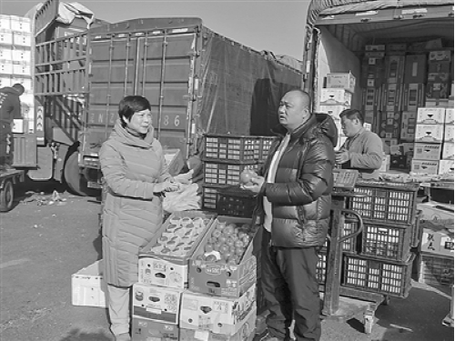 近日,唐俊杰委員到北京新發(fā)地市場(chǎng)進(jìn)行調(diào)研,圖為向西紅柿單品經(jīng)銷商大王蔬果有約經(jīng)理李廣西了解近期蔬菜供銷情況。